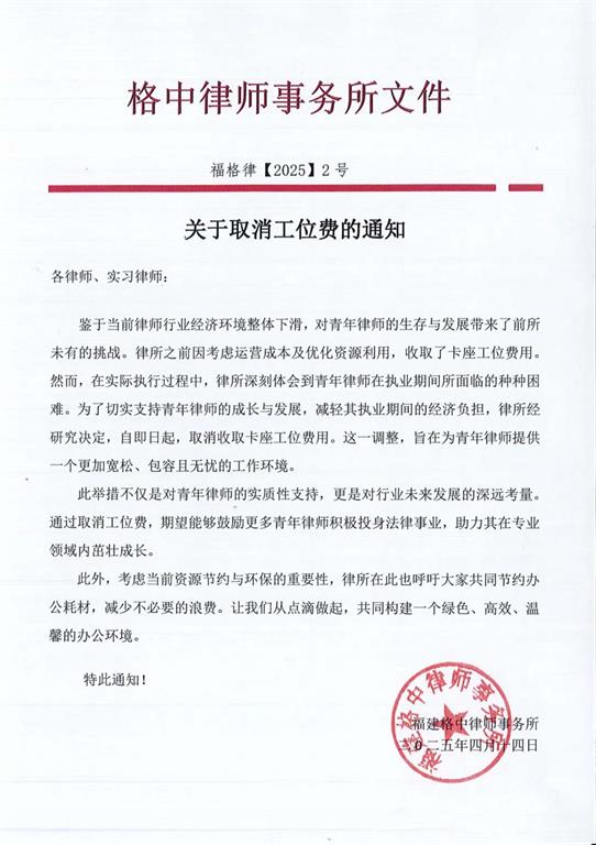 律师行业在经济下滑的浪潮中,正面临着前所未有的挑战,尤其是对于满怀激情与梦想踏入这一领域的青年律师而言,更是步履维艰。此次取消工位费,能够帮助青年律师降低执业成本、提高工作效率,助力其在法律行业的稳健发展提供有力保障和动力。 困境之中往往孕育着转机,每一次挑战都是成长的契机,只要心中有光,脚下就有路。在此,格中律所愿每一位青年律师都能在心中点亮那盏明灯,照亮前行的道路,迎接属于自己的辉煌未来。