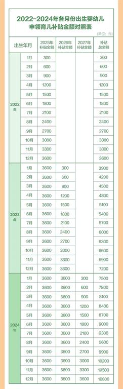 为了方便群众申领,相关部门制定了2022年至2024年各月份出生的婴幼儿申领补贴金额对照表,可以一目了然地知道每一个孩子的申领补贴金额。